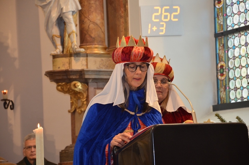 Beim heutigen Gottesdienst zogen vier der insgesamt acht Sternsingergruppen, die seit Weihnachten in Eidenberg unterwegs waren, mit ihren bunten Gewändern in die Pfarrkirche Eidenberg ein. Bei ihrem Sternsingerlied "A Liacht in da dunklen Zeit" wurden sie von einer Bläsergruppe unterstützt.