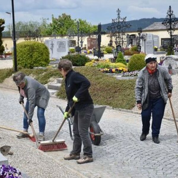 Jetzt vor Fronleichnam war es wieder so weit. Freiwillige aus den Dörfern Kerschbaum und Passberg putzen heute mit dem Verein zur Ortsverschönerung und Dorferneuerung den Friedhof.