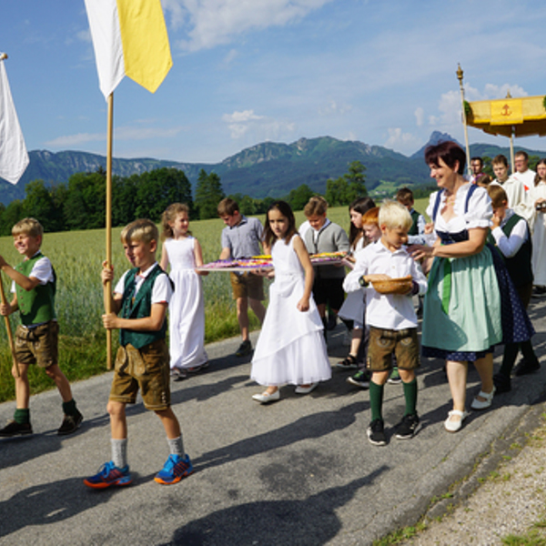 P. Christoph Eisl feierte in Viechtwang den Gottesdienst und die Prozession. Diese Mal führte die Prozession bei strahlendem Sonnenschein übers Moar. Auch die Erstkommunionkinder waren eingebunden und gestalteten ein Blumenbild.