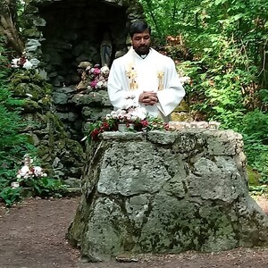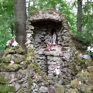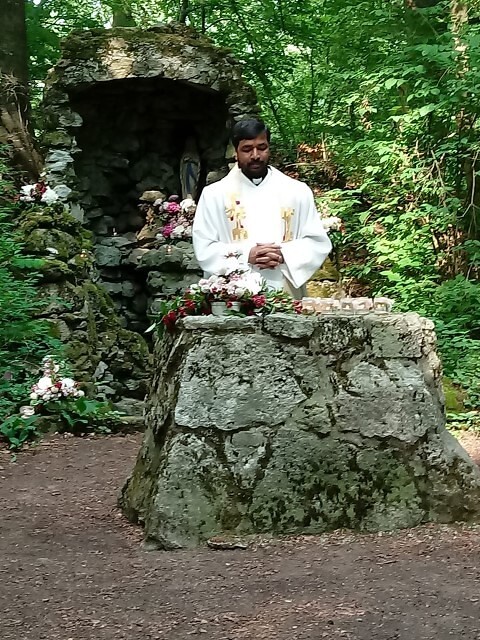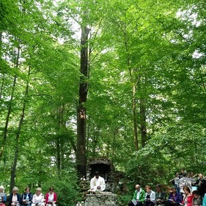 Unter freiem Himmel, in der Mariengrotte, wo angeblich einst die Burg Dachsberg stand, wurde bei schönem Wetter die Maiandacht gefeiert.
